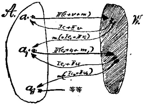 A——资本家,W——直接生产者。a,a1,a11——资本主义企业。 箭头表示被交换的商品的运动。c,v,m——商品价值的组成部分。 Ⅰ,Ⅱ——商品的实物形式:Ⅰ——生产资料,Ⅱ——消费资料。 |