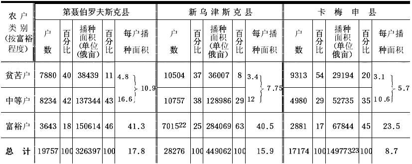 汇编中的分类,在第聂伯罗夫斯克县以每户的播种面积亩数为标准,其余二县则以役畜头数为标准。