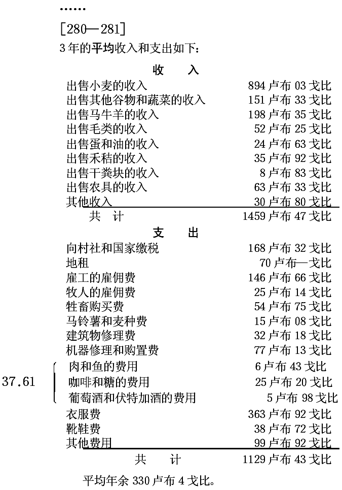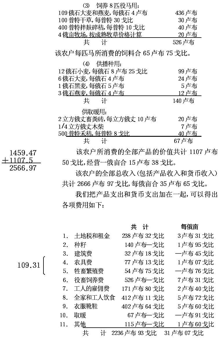 每俄亩经营面积的收入合20卢布27戈比。但是这仅仅是货币收入。为了求得全部总收入数额,必须把该农户所消 费的产品的全部价值加进去。根据这位主人的记载,他自己经营的产品的年消费量如下: