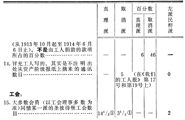 第15条。这项材料特别重要,最好是进行一次专门的调查来加以补充和核对。这些材料是我们从1914年圣彼得堡波涛出版社出版的《工人手册》171上引来的。属于取消派工会的有办事员、制图员和药剂师(1914年4月27日举行的最近一次印刷工会理事会的选举结果,有一半的理事和一半以上的候补理事属于真理派)。属于民粹派工会的有面包工人和制盒工人。会员总数约有22000人。