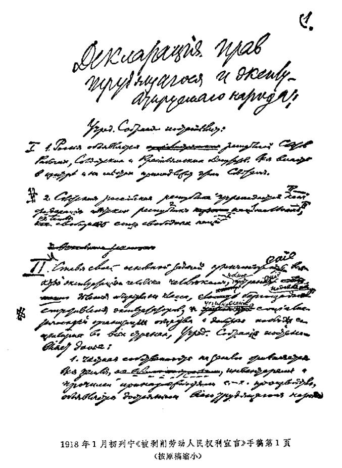 107 《被剥削劳动人民权利宣言》的草案是在全俄中央执行委员会1918年1月3日(16日)会议上提出的。草案以多数票(有两票反对,一票弃权)通过后,交协商委员会最后审定。《宣言》发表于1月4日(17日)《真理报》第2号和《中央执行委员会消息报》第2号。1月5日(18日),雅·米·斯维尔德洛夫在立宪会议第一次会议上代表全俄中央执行委员会宣读了《宣言》,并建议批准。立宪会议的反革命多数拒绝予以讨论。《宣言》于1月18日(31日)被全俄苏维埃第三次代表大会批准,后来被写入1918年俄罗斯联行宪法,作为它的第1篇。全俄苏维埃第三次代表大会通过宣言时,删去了原稿中涉及立宪会议的地方。