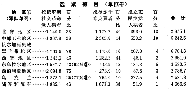 社会革命党人1出版的文集《俄国革命的一年(1917―1918年)》(1918年莫斯科土地和自由出版社莫斯科版)里,载有尼·瓦·斯维亚季茨基的一篇饶有趣味的文章:《全俄立宪会议选举的结果(序言)》。总共79个选区,作者列举了其中54个选区的数字。