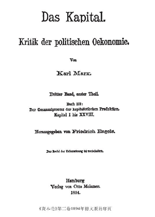 马克思逝世后,恩格斯承担了《资本论》后两卷的编辑出版工作,把第二册编成第二卷,第三册编成第三卷。1885年2月恩格斯完成第二卷的编辑工作后,立即着手辨认和口授第三卷的手稿,到7月底形成了一部“誊清稿”。他以第三册第I稿为基础,吸收第II、III稿的成果,并请人整理和简化了方程式手稿,吸收到正文中。他还结合马克思逝世后出现的经济现象补写了某些片断。原手稿分为七章,恩格斯将它编成七篇五十二章,并在卷末写了两个增补:《价值规律和利润率》和《交易所》。关于恩格斯对各篇章内容的具体编辑工作,他自己在第三卷《序言》中作了较详细的说明。恩格斯本想尽早完成第三卷的编辑出版工作,但领导国际工人运动的重担、各种学术和著述活动以及健康状况的恶化,使这项工作历时十年才完成,1894年11月《资本论》第三卷在汉堡出版。