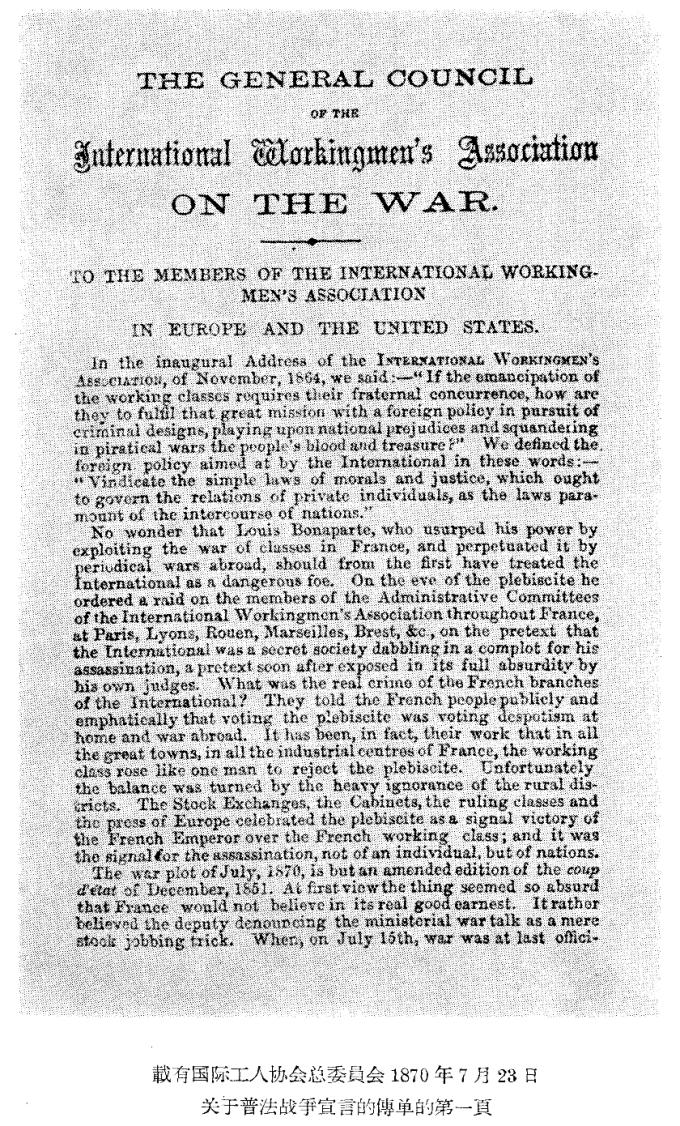 “在保持欧洲均势和维护民族荣誉的借口下,政治野心又威胁世界和平了。法国、德国、西班牙的工人们!把我们的呼声联合成为共同反对战争的怒吼吧!……争夺霸权的战争,或维护某一王朝利益的战争,在工人看来只能是犯罪的胡作非为。我们渴望和平、劳动和自由,我们坚决反对那些能赎免‘血税’并利用社会灾难来进行新的投机的人的黩武号召!……德国弟兄们!我们相互仇视只会使专制制度在莱茵河两岸都获得完全胜利……全世界的工人们!不论我们的共同努力在目前会产生怎样的结果,我们这些不分国界的国际工人协会会员,总是代表法国工人向你们表示良好的祝愿和敬意,作为我们牢不可破的团结的保证。”