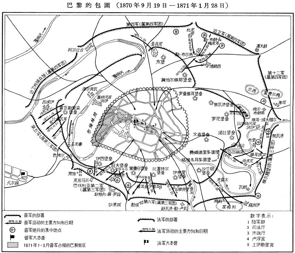 从圣诞节起对巴黎的真正围攻开始了。在这以前,只不过是包围了这个巨大的要塞而已。固然,已构筑好重型攻城炮的炮台并且集结了攻城炮兵,但是没有一门火炮进入阵地,没有开设一个炮眼,没有发射一发炮弹。所有这些准备工作都是在巴黎的南面和西南面进行的。在其他方面也构筑了胸墙,但显然只是用于防御的目的,用于抵抗出击和掩护围攻军队的步兵和野战炮兵。这些工事距巴黎各堡垒自然要比炮队在正规围攻时所应配置的地点远;在这些工事和堡垒之间,有一个没有被任何一方占领的宽阔地带,这是法军可用以进行出击的地方。当特罗胥于11月30日进行的一次大规模出击被击退时,他仍然控制着巴黎东面这一地带的一部分地区,包括罗尼堡垒前面独立的蒙亚佛隆高地。特罗胥已开始在这个高地上构筑工事;从哪一天起,我们不确切知道,但12月17日我们听到有人提及,不论是蒙亚佛隆高地或者瓦朗各高地(在马尔纳河弯曲处),都已构筑了工事,并且配置了重炮。