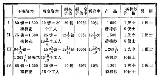 假定:花费资本100(不变资本和可变资本),由这笔资本推动的劳动提供等于预付总资本1/5的剩余劳动(无酬劳动),或者说,提供等于100/5的剩余价值。因此,如果预付资本等于100镑,总产品的价值就应该等于120镑。再假定平均利润等于10%;在这种场合,110镑就是总产品(在上例中是煤)的费用价格。100镑的资本,不管开采的是富矿还是贫矿,在剩余价值率或剩余劳动率既定时转化为120镑的价值;总之,劳动的不同生产率,不论它是劳动的不同自然条件的后果,还是劳动的不同社会条件的后果,还是不同技术条件的后果,都丝毫不会改变商品价值等于物化在商品中的劳动量这一论点。