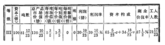 至于Ⅱ,这里产品的[实际]价值也等于120镑等等。但是因为每吨个别价值等于1+(11/13)镑(或24/13镑),所以这个等级生产65吨(因为120除以24/13等于65)。简单地说,我们在这里得到的是第574页上的A表。但是因为在这里我们需要有几个新项目来适应我们的目的,所以当出现Ⅰ这个等级而产品市场价值提高到2镑时,我们就要为这第三种场合制一个新表。