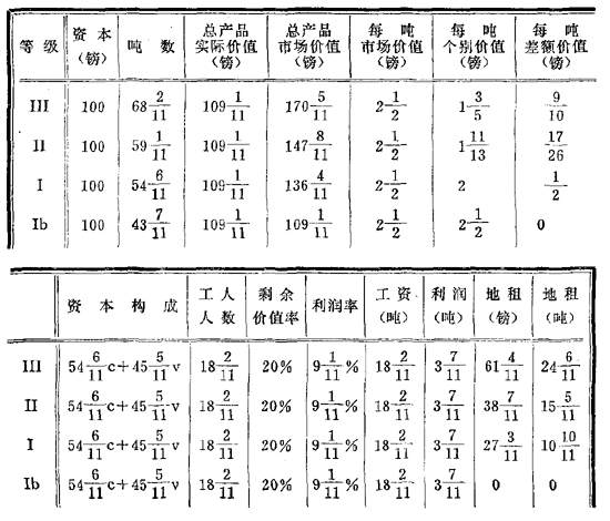 但是,因为Ⅲ的每吨个别价值等于1+(3/5)镑(或8/5镑),所以Ⅲ生产[109+(1/11)]∶(8/5),即68+(2/11)吨(换句话说,这里109+(1/11)镑等于68+(2/11)吨)。其次,每吨市场价值和每吨个别价值的差额现在是2+(1/2)镑减1+(3/5)镑,或者说,2镑10先令减1镑12先令,即18先令。以68+(2/11)吨计算,就是[68+(2/11)]×18先令=1227+(3/11)先令=61+(4/11)镑。Ⅲ的产品不是卖109+(1/11)镑,而是卖170+(5/11)镑。这个余额就是Ⅲ的地租。用吨来表示,地租=24+(6/11)吨。