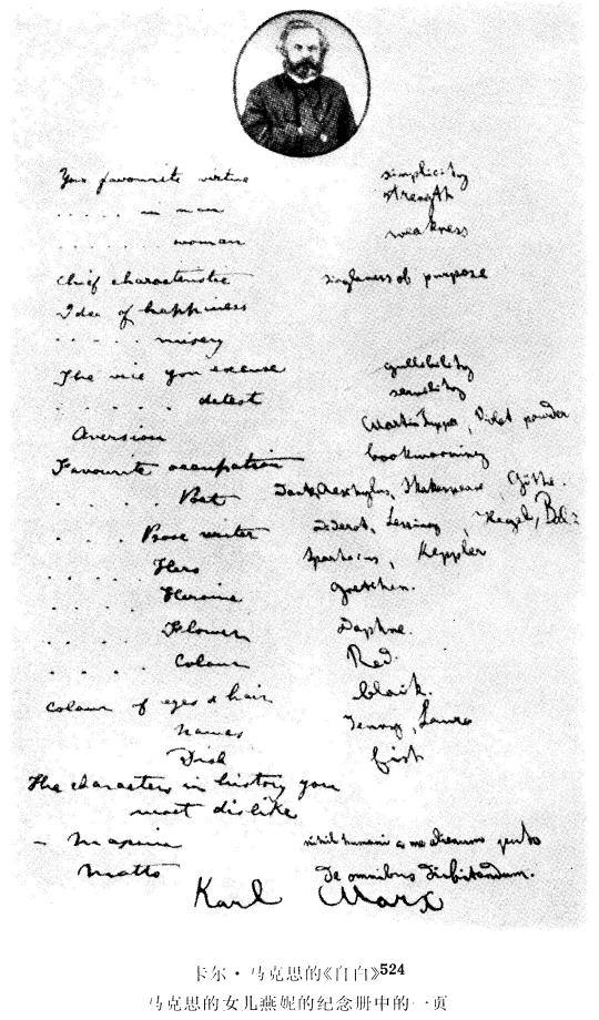 523 马克思的这篇同莱昂·菲力浦斯和南尼达·菲力浦斯的信一起发表在1956年《社会历史国际评论》上的《自白》和它的另外两个文本稍有出入。这两个文本,一个是在马克思的女儿燕妮的纪念册中保存下来的手抄稿,本卷发表的照片就是这个手抄稿的真迹复制品;另一个是劳拉·马克思的手抄稿(见《回忆马克思恩格斯》人民出版社1957年版第304-305页)。―第588页。
